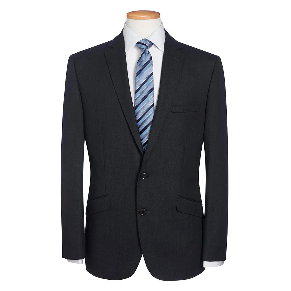 Schmal geschnittener Sakko mit einer Brustleistentasche, 2 Knöpfen in der vorderen Mitte, schmales Revers mit abgesteppter Naht, zwei seitliche Schlitze im Rückenteil, maschinell waschbar und knitterarm.