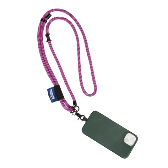 Innovative, längenverstellbare Handykette kompatibel mit jeder Handyhülle, aus Polyester mit 2-farbig gewobenem Band, Sicherheitsverschluss und Karabiner, Mindestbestellmenge 300 Stück