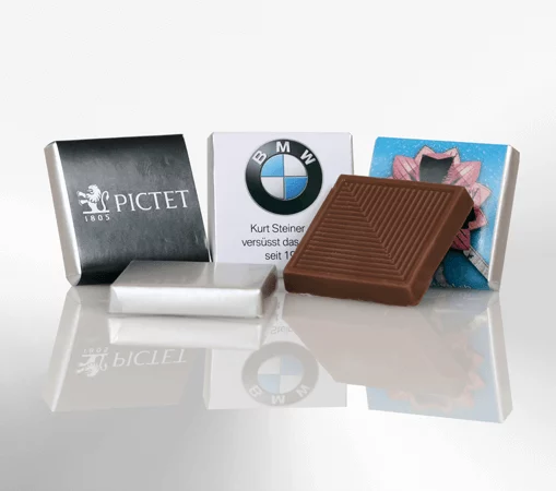 Schweizer Premium Schokolade (Vollmilch 37%, ohne Palmöl), einzeln verpackt in Folie (gold oder silber) mit Papierbanderole, Haltbarkeit ca.