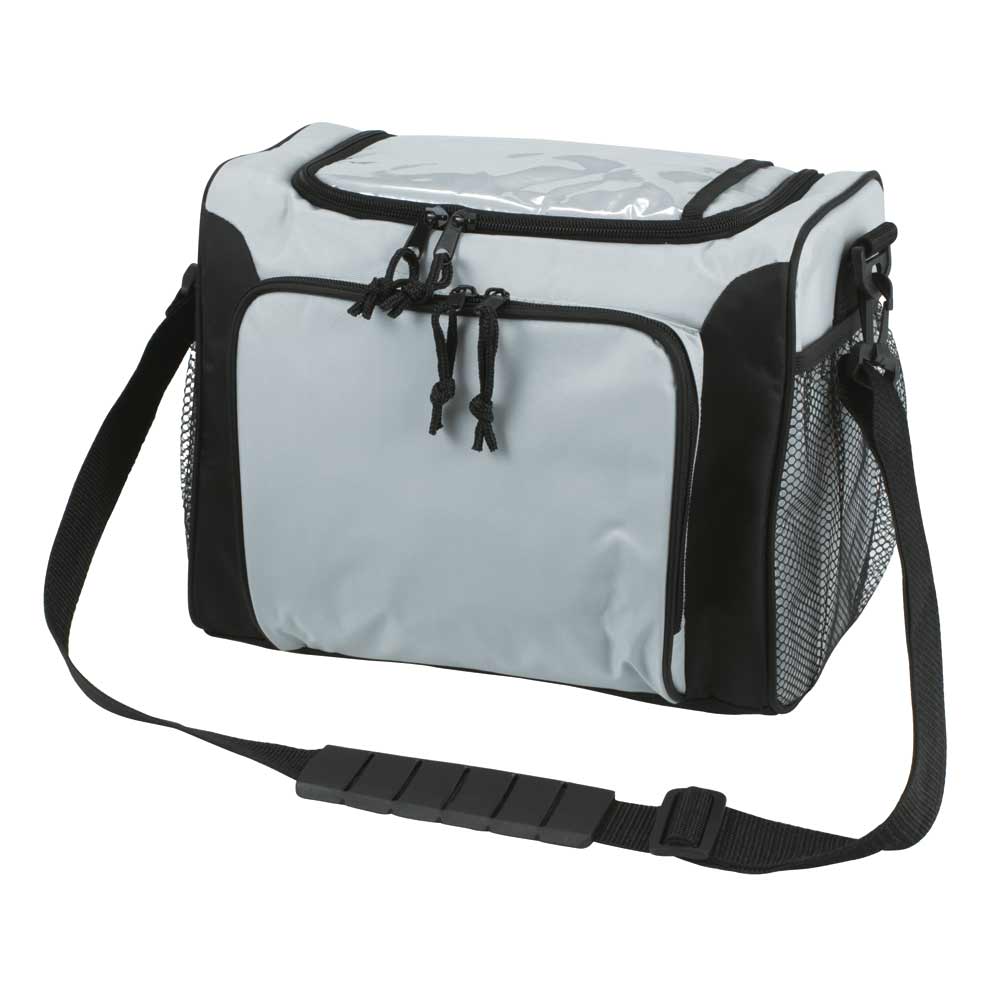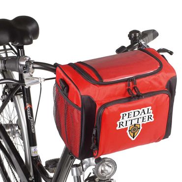 Kühlende Tasche aus Nylon, mit grossem Hauptfach, Vortasche mit Zwei-Wege-Reissverschluss, Netz-Seitenfächer, Kartenfach auf Oberseite, abnehmbarer Umhängegurt, rückseitige Gurtschlaufen zur Befestigung am Fahrradlenker