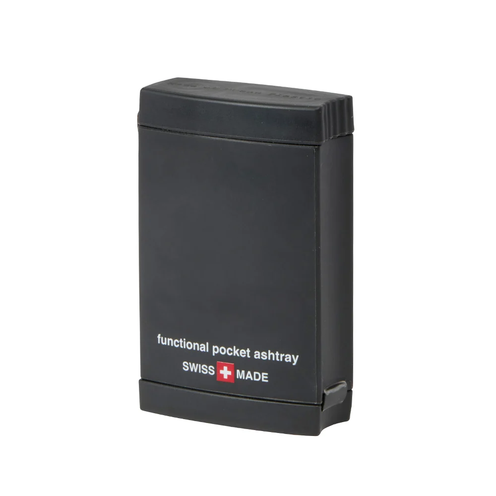 Swiss Made, nachhaltig, innovativ und funktional! Leichter, geruchsdichter und ausschüttsicherer Taschenaschenbecher mit Einhandbedienung, hergestellt aus meeresgebundenem Kunststoff, mit integrierter Auslöschhilfe sowie Deckel an Ober- und Unterseite für die einfache Leerung und Reinigung, Mindestbestellmenge 100 Stück