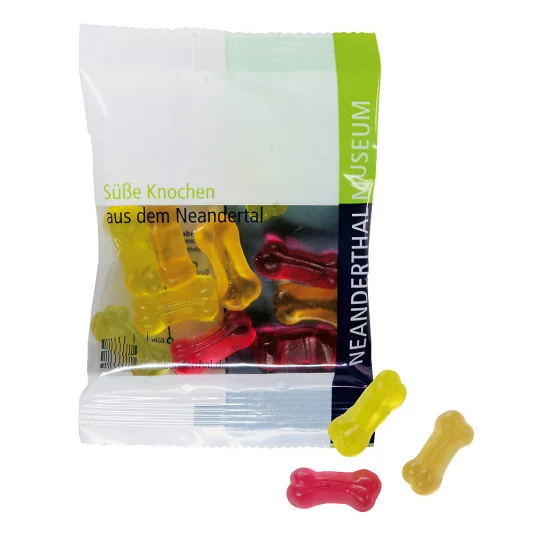 Fruchtgummis von Trolli in Mini-Tüte aus kompostierbarer Folie, mit 10% Fruchtsaftanteil, in verschiedenen Standardformen erhätlich (z.