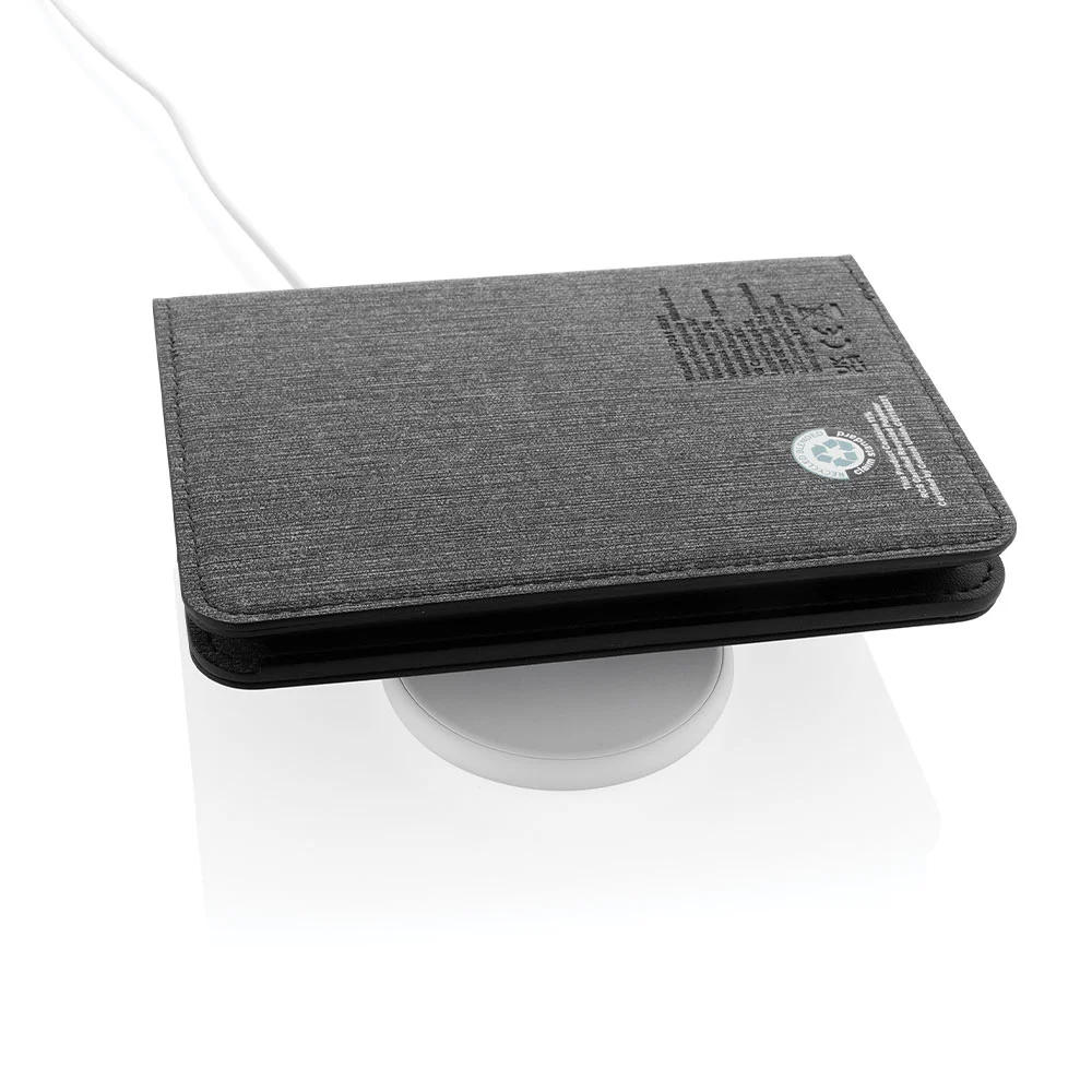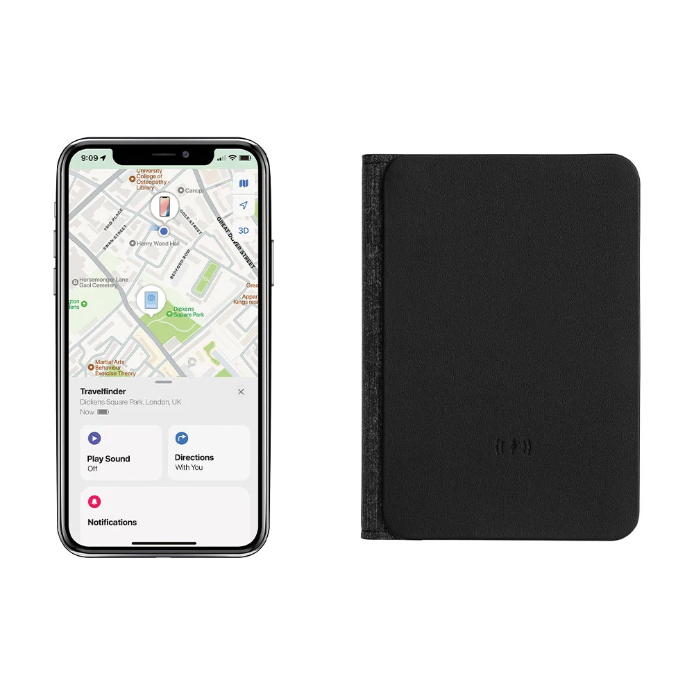 Elegantes Etui für Reisepass und Karten, mit integriertem Trackmate zur weltweiten Verfolgung bei Verlust, hergestellt aus rezykliertem Polyester; kompatibel mit der Apple-‚Find My‘-App und kabellos innert 1 Stunde für eine Nutzungsdauer von bis zu 4 Monaten wieder aufladbar
