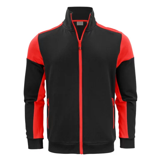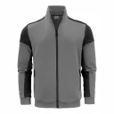 Zweifarbige Sweatjacke mit Stehkragen und durchgehendem, kontrastfarbigem Reissverschluss vorne und an den Seitentaschen.