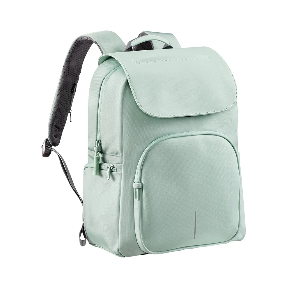 Stylischer Rucksack aus wasserabweisendem rezykliertem PET, mit diebstahlsicherem Klappdeckel und zusätzlich geschützten Reissverschlüssen, einem RFID-geschützten Fach für garantierten Schutz vor Datendiebstahl sowie einem 16"-Laptopfach, Inhalt 15 l