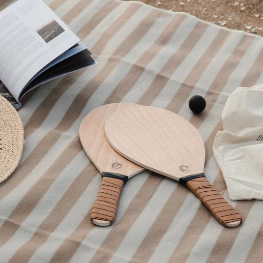 Elegantes Beach-Tennis Spiel aus Pappelholz mit PU-Griffen für einen bequemeren Griff, enthält zwei Schläger und zwei Gummibälle, verpackt in einer Baumwolltasche, ausschliesslich für den Gebrauch im Trockenen gedacht