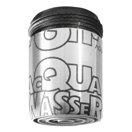 Swiss Made, bequem und elegant Energie und Wasser sparen! Cleverer Sparaufsatz aus Edelstahl, für den Wasserhahn in Küche und Bad, reduziert den Wasser- und Energieverbrauch um bis zu 50%, individuelle Rundumgestaltung ab 100 Stück, Logo und Design werden mittels anthrazitfarbener Keramik dauerhaft aufgebracht