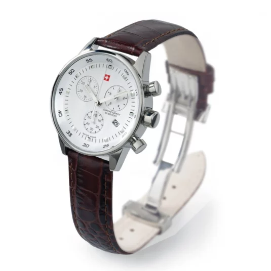 Swiss Made Chronograph Mineralglas EdelstahlgehäuseUnisex: Ø 36 mm / Lady: Ø 30 mm Wasserdicht bis 50 m Quarzwerk Datum Lederband Schwarzes oder weisses Zifferblatt inklusive Verpackung Blackbox No.