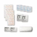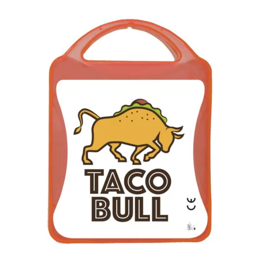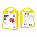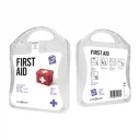 Praktische, kleine Notfall-Box aus gefrostetem Kunststoff, befüllt mit folgendem Inhalt: 12 wasserfeste Pflaster, 4 hautreinigende Tupfer, 2 Trockentupfer, 1 elastischer Verband, 2 Mullbinden für Brandwunden