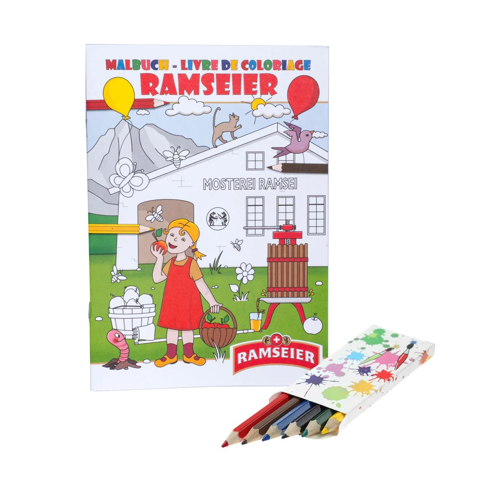 Einmaliges Malbuch für Klein bis Gross - passend für jede Zielgruppe! Set bestehend aus individuell erstelltem Buch mit 4 Umschlags- (300 g/qm) sowie 12 Innenseiten (100 g/qm) und 6 kurzen (9 cm) Farbstiften aus nachhaltig produziertem Holz, Mindestbestellmenge 1000 Stück