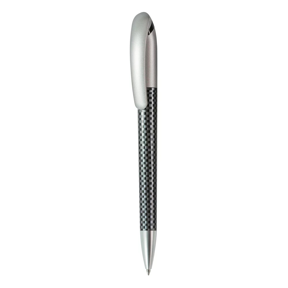Swiss made, Drehkugelschreiber aus Kunststoff im Carbonlook, mit Metallspitze, robustem Clip und hochwertiger Kunststoff-Grossraummine (blau oder schwarz)