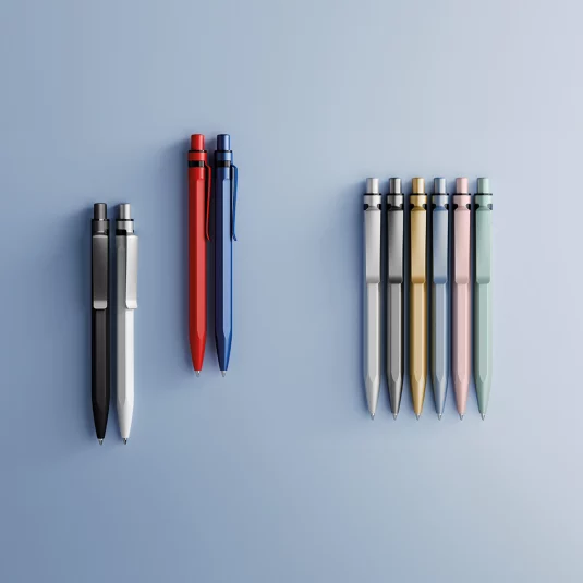 Mineralien statt Plastik! Swiss made, hochwertiger Kugelschreiber, hergestellt aus einem mit Mineralien angereicherten Spezialmaterial, was den rezyklierten Kunststoffanteil (farbig zu 50 %, schwarz oder weiss zu 100 %) um nachhaltige 60% reduziert, mit optimaler Griffzone, Metall-Clip und Kunststoff-Grossraummine (schwarz oder blau)