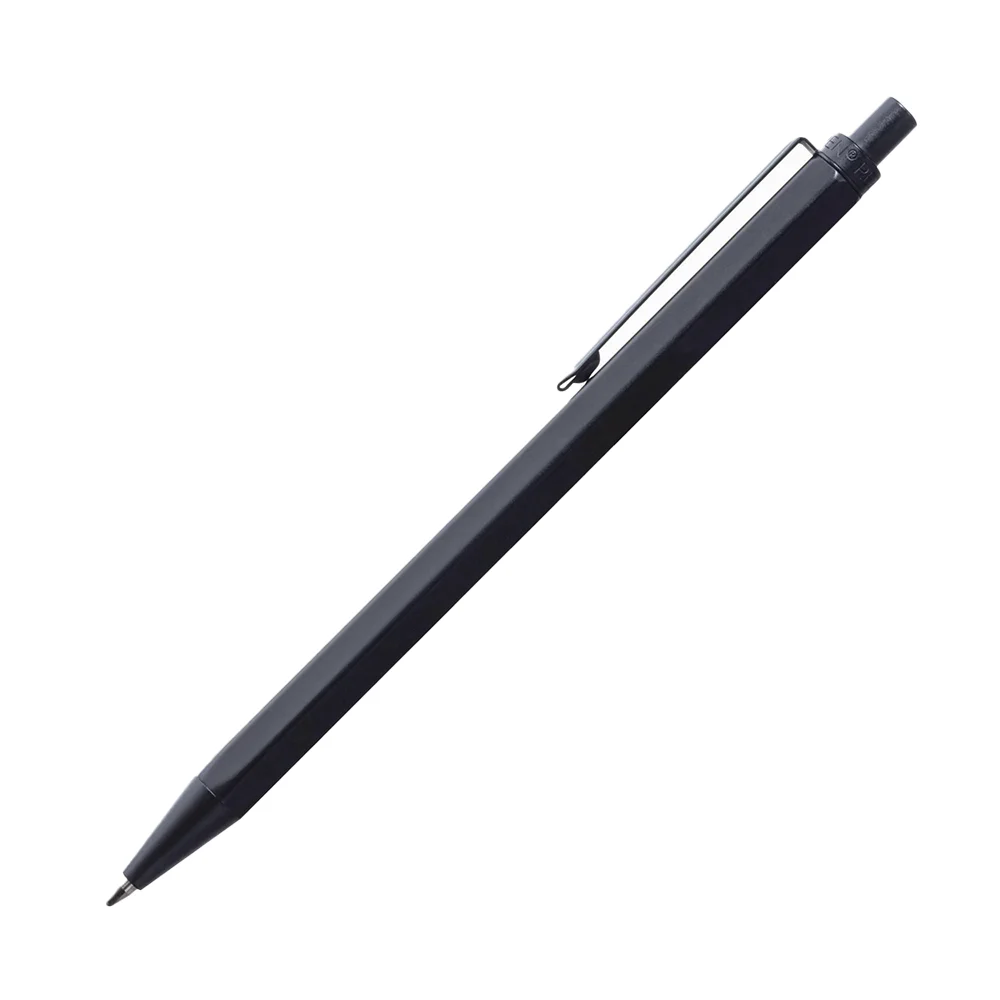 Swiss Design – ein hochwertiges, schlankes Schreibgerät mit nickelbeschichtetem Messingschaft und verchromten Beschlägen, ausgestattet mit einer Metall-Grossraum-REZPEN®-Mine (blau), die auf Schweizer Präzisionsmaschinen gefertigt wird und eine Schreiblänge von über 5'000 Metern bietet