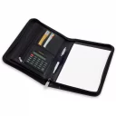 Edle Tagungsmappe aus feinstem Lederimitat, mit Reissverschluss, integriertem Solar-Taschenrechner, Organizer und Metallplakette, wird mit kariertem Block geliefert