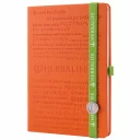 Originelles, individuell gestaltetes Notizbuch, Material Tucson, Elastikband und Stiftschlaufe in individueller Farbe (Pantone) mit Aufdruck, Lanybutton mit Geldoming, Blindprägung auf Deckel