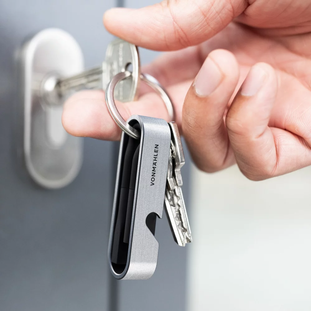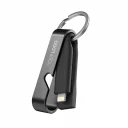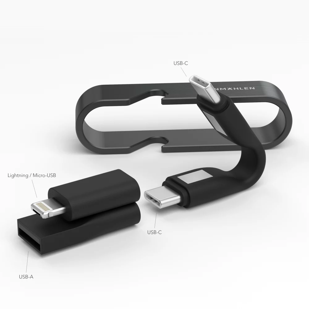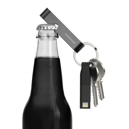 Innovatives, multifunktionelles USB-Schnellladekabel HIGH SIX® aus Edelstahl, Kunststoff und rezykliertem Kupfer, zum Aufladen von allen mobilen Endgeräten, der praktische Flaschenöffner dient gleichzeitig als Schutzhülle für das Kabel, mit Schlüsselbund-Ring