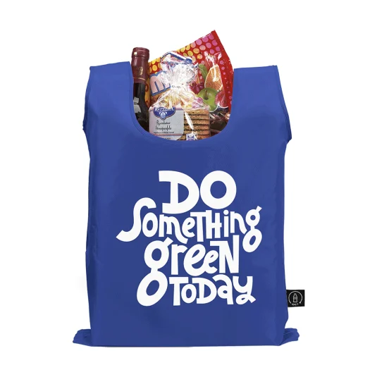 Foldable shopping bag made from recycled PET bottles (190T RPET polyester), quick and compact to store in the integrated bag with press stud and snap hook.