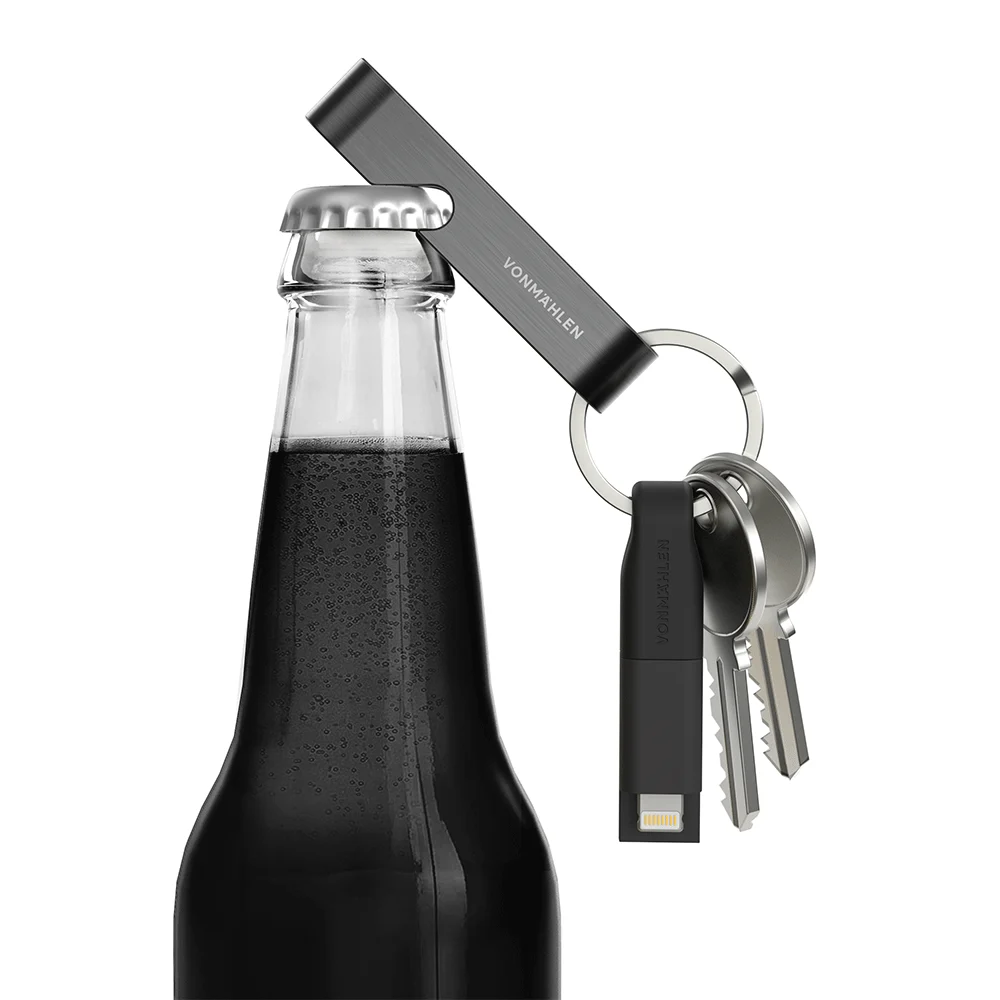 Innovative, multifunctional USB fast charging cable HIGH SIX® made of stainless steel, plastic and recycled copper, for charging all mobile devices, the practical bottle opener also serves as a protective cover for the cable, with key ring Colouring of cable and adapter according to Pantone possible from 500 pieces (prices on request) Adapter: USB-A, 2in1 connector (Micro-USB / compatible with iPhone / iPad) Connector: 2× USB-C Charging speed:- USB-C to USB-C: 3 A (60 W)- USB-C to Lightning: 2.