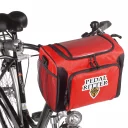 Cooling bag of nylon, with large main compartment, front pocket with 2-way zipper, mesh side pocket, card pocket on top, removable shoulder strap, back belt loops for attaching to bicycle handlebars