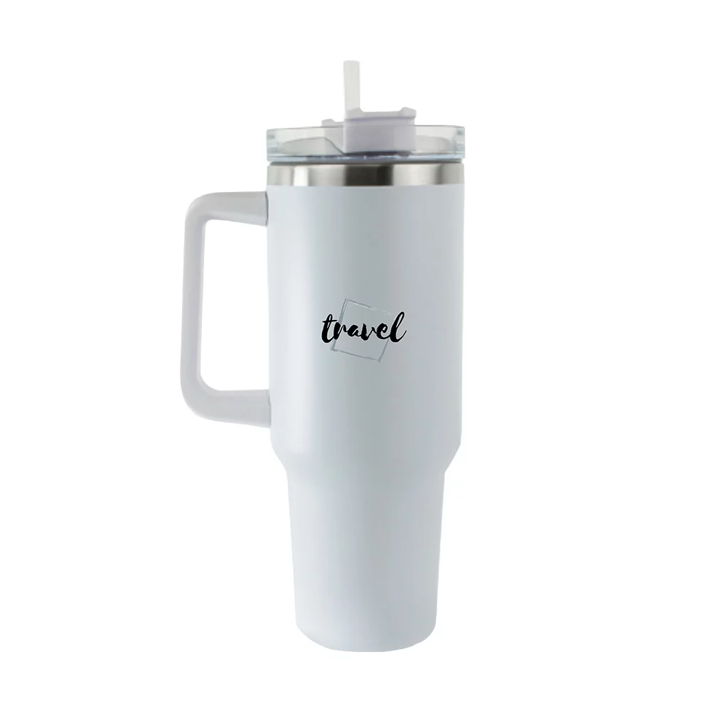 Stainless steel tumbler with slim design, ergonomic handle, screw-on lid and straw for leak-proof drinking, keeps warm or cool for several hours, capacity 1,1l