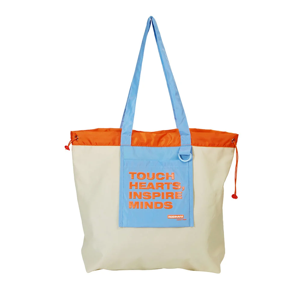 Sustainable, stylish bag made from robust 300D rPET with a large main compartment and elastic closure strap, original outer pocket with customised 3D print, practical ring for attaching key rings or small accessories, and long, sturdy handles (75 × 3 cm), minimum order quantity 300 pieces.