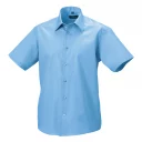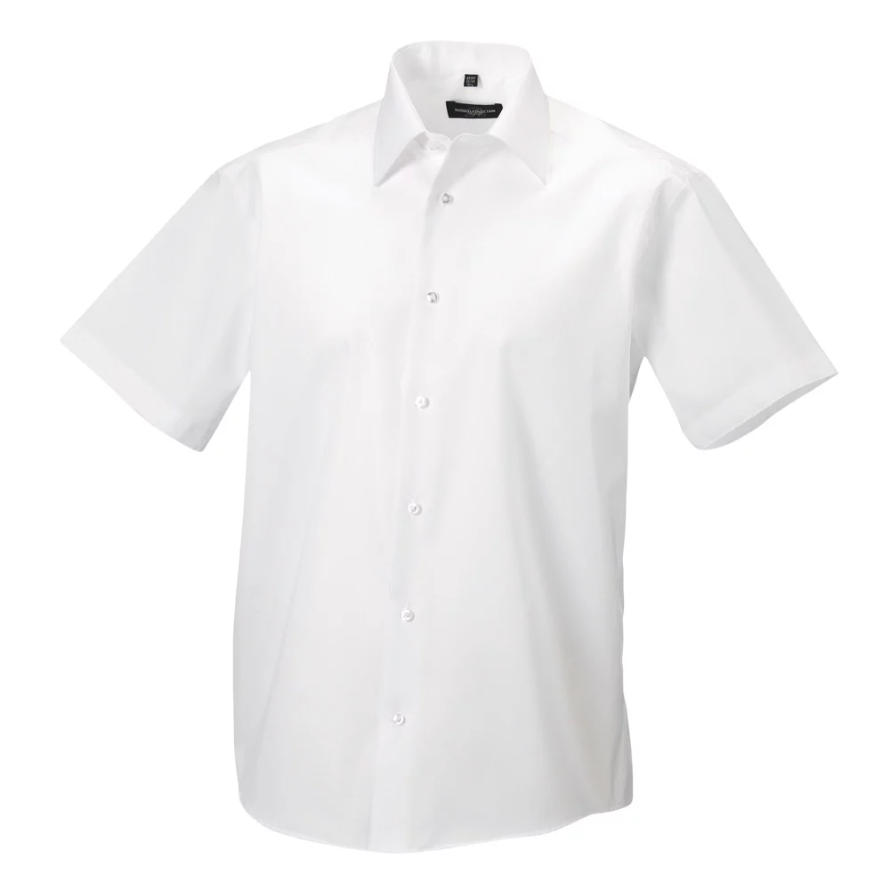 Russel body-skimming short-sleeved men's shirt of no-iron fabric, half spread collar stiffened with stays, rounded hem