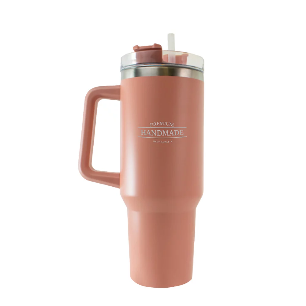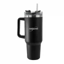 Stainless steel tumbler with slim design, ergonomic handle, screw-on lid and straw for leak-proof drinking, keeps warm or cool for several hours, capacity 1,1l