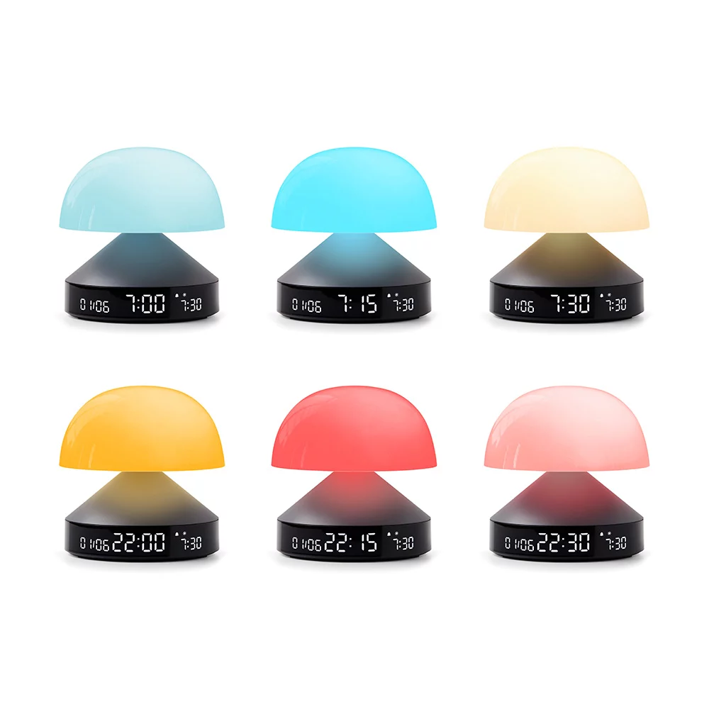 Stylish designer alarm clock made of aluminium, with pleasant sunrise/sunset simulation, 9 different, dimmable LED colour settings and soft, natural wake-up melodies, with LCD display, touch/snooze function and an operating time of 4 months without recharging, supplied with USB-C cable