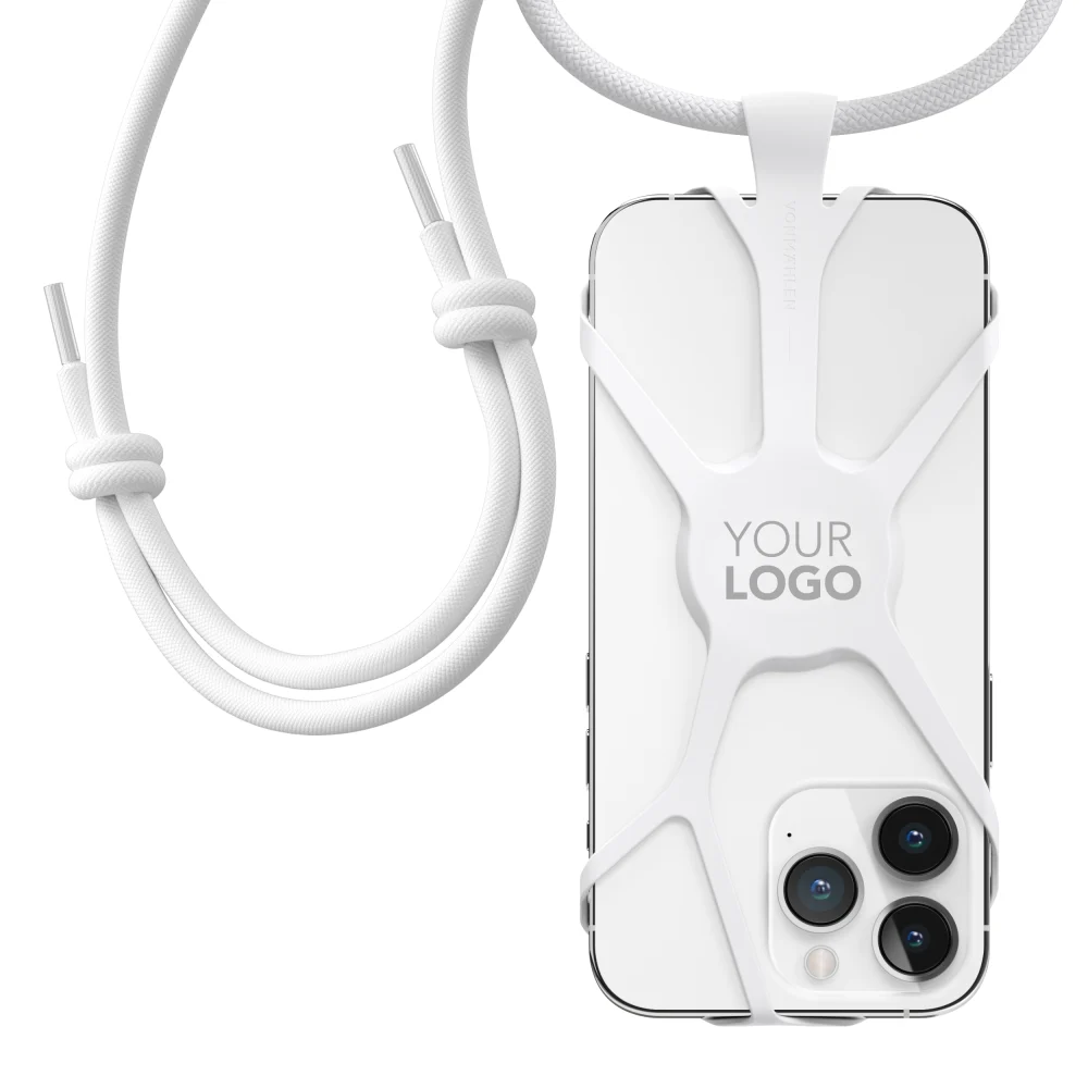 Trendy, universal smartphone chain made of hard-wearing silicone and an adjustable (up to 150 cm) nylon cord (55% recycled materials) with knot design, compatible with all common mobile devices