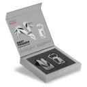 Set consisting of a small, precise multifunctional tool made of stainless steel with 14 functions; pliers with wire cutter, two blades (one serrated), two flat-blade screwdrivers, a flat-blade screwdriver/cap lifter combination, Phillips screwdriver, can opener, file, belt pouch and two hexagon spanners integrated in the handle, as well as another indispensable tool made of stainless steel for the key ring, with 16 functions; bottle opener, small and large slotted screwdriver, Phillips screwdriver, cable puller, two bicycle spoke spanners, seven hexagon spanners, centimetre ruler and nail puller, supplied in a beautiful gift box Grip Tool Pocket size: 6.