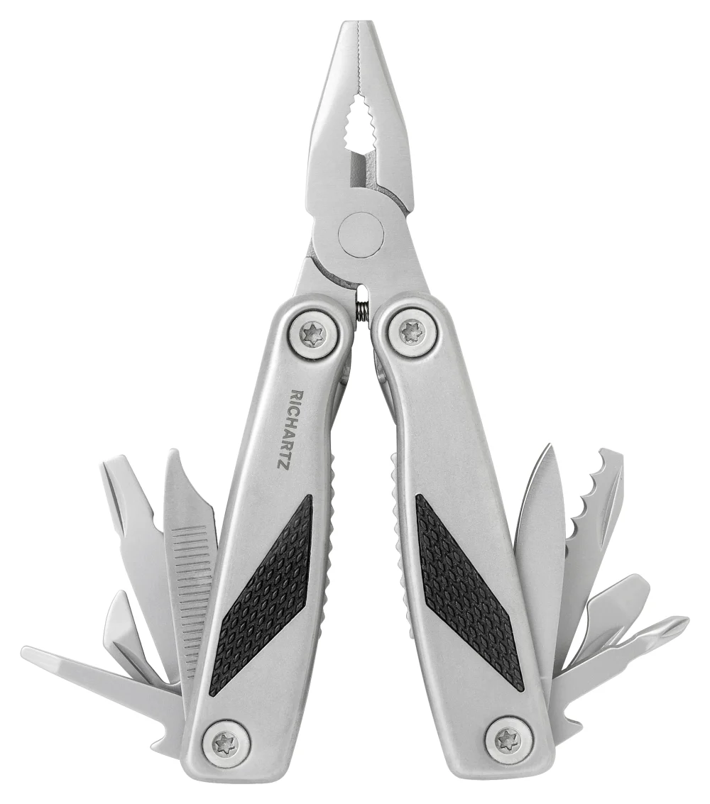 Set consisting of a small, precise multifunctional tool made of stainless steel with 14 functions; pliers with wire cutter, two blades (one serrated), two flat-blade screwdrivers, a flat-blade screwdriver/cap lifter combination, Phillips screwdriver, can opener, file, belt pouch and two hexagon spanners integrated in the handle, as well as another indispensable tool made of stainless steel for the key ring, with 16 functions; bottle opener, small and large slotted screwdriver, Phillips screwdriver, cable puller, two bicycle spoke spanners, seven hexagon spanners, centimetre ruler and nail puller, supplied in a beautiful gift box Grip Tool Pocket size: 6.