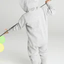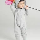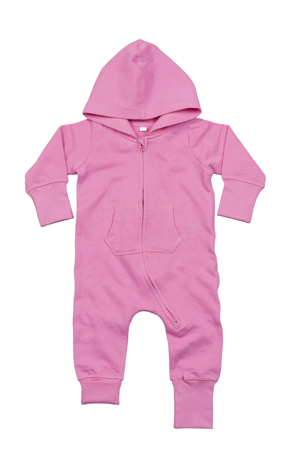 Baby all-in-one with very soft and fluffy inside, single hood, saddle in the neck, neck tape, zip from neck to lower leg for easy dressing and finishing, kangaroo pocket, wide ribbed cuffs and leg ends, easy to relabel.
