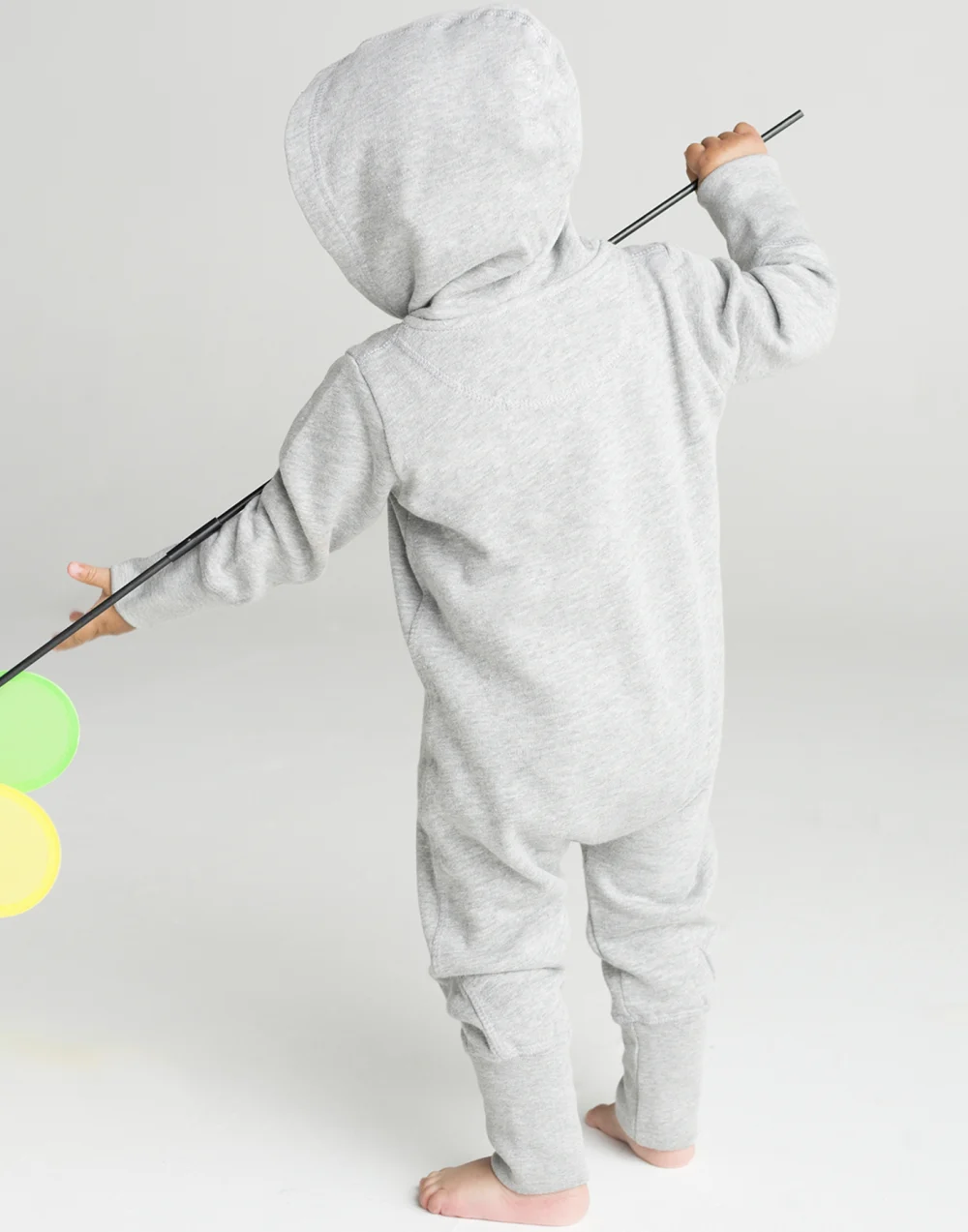 Baby all-in-one with very soft and fluffy inside, single hood, saddle in the neck, neck tape, zip from neck to lower leg for easy dressing and finishing, kangaroo pocket, wide ribbed cuffs and leg ends, easy to relabel.