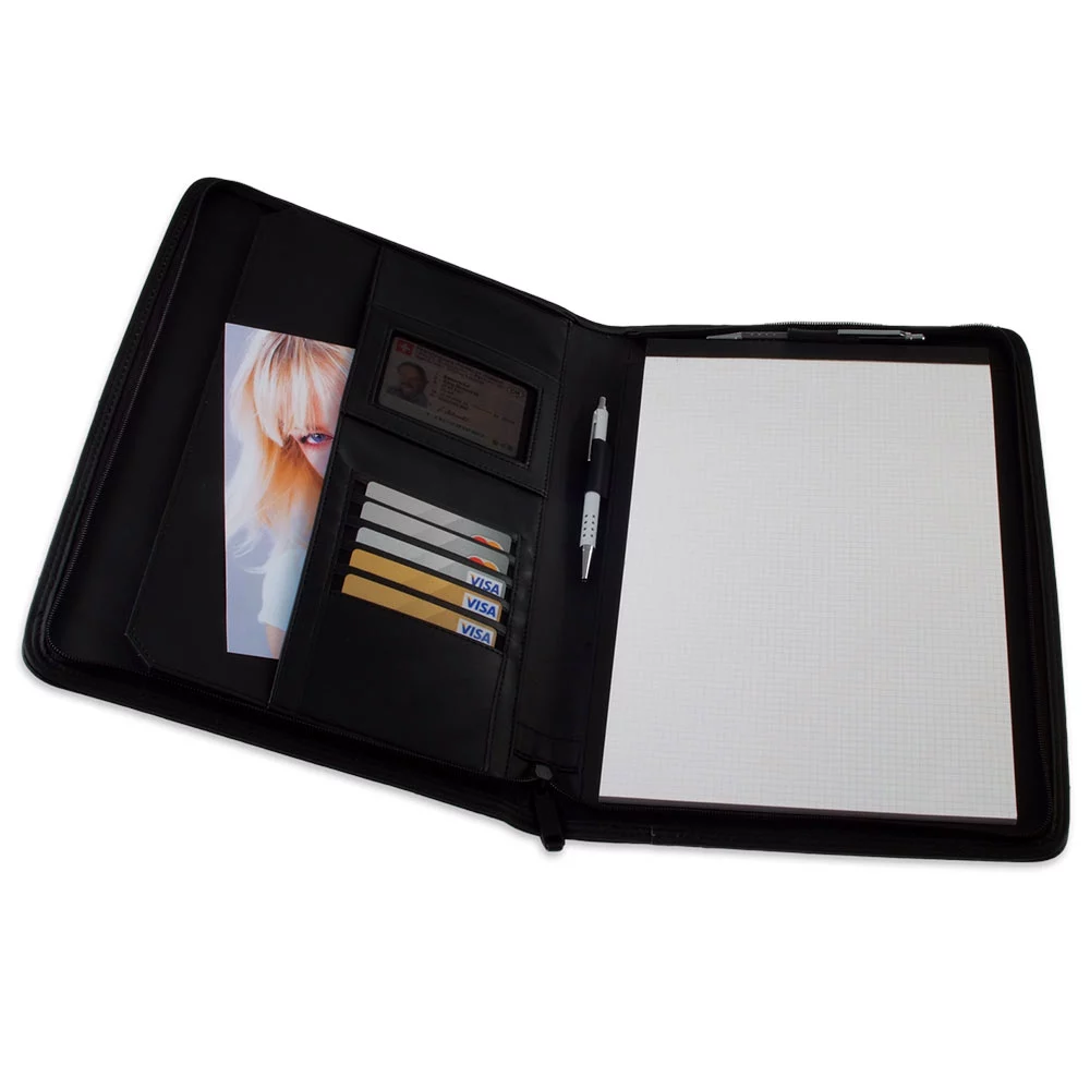 Slightly oval conference folder of artificial leather, with zipper and various compartments and pockets, delivered with checked pad