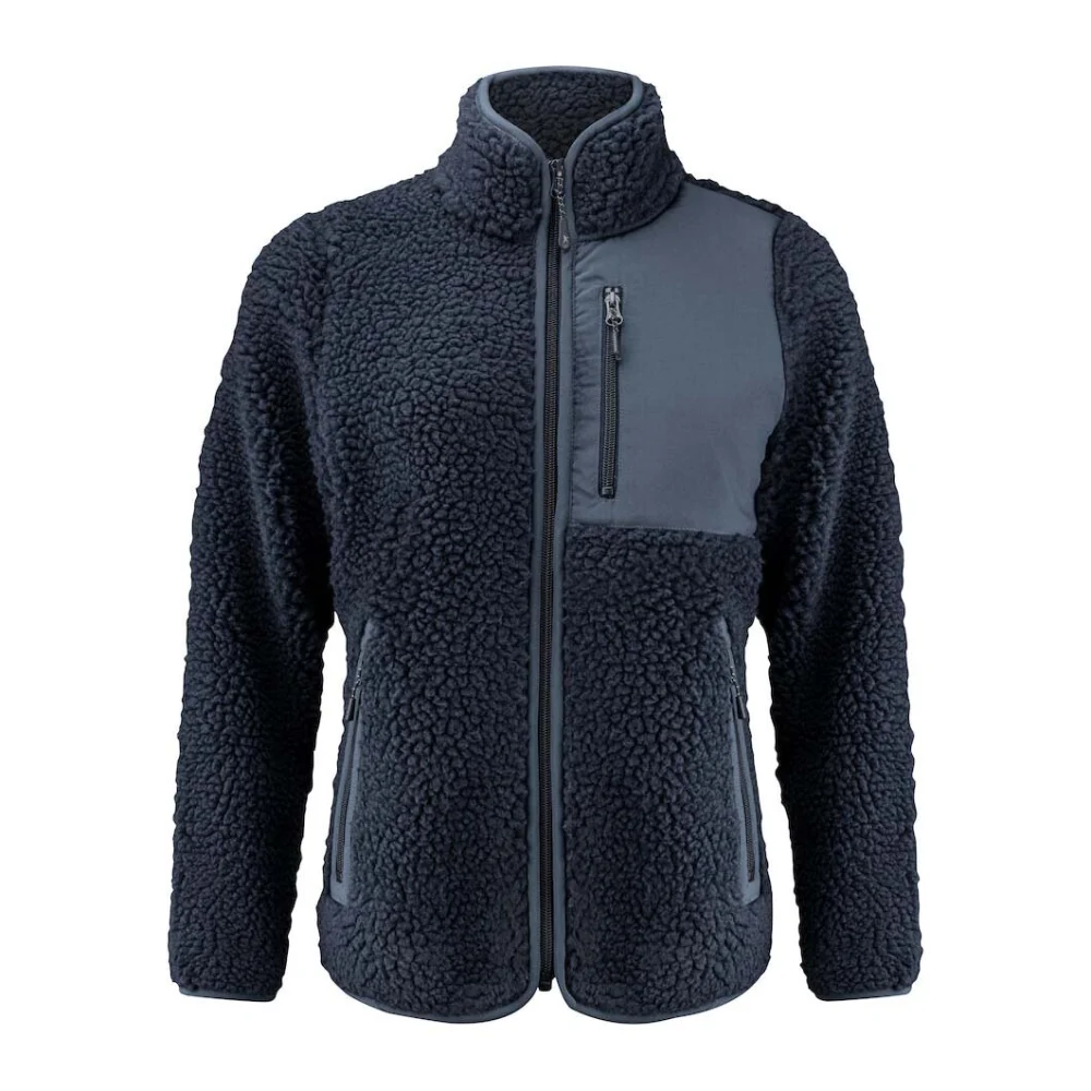 Soft and warming women's sherpa fleece jacket as an element of the layering concept. Two-coloured women's sherpa fleece jacket. Contrasting material on the chest and piping along the edges of the seams. Chest pocket and side pockets with zip. This item is supplied in a compostable polybag.