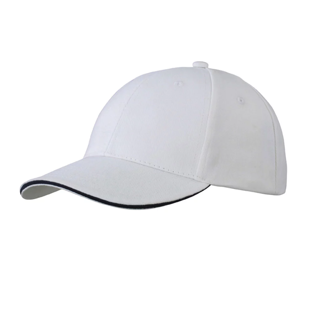 Myrtle Beach 6-panel sandwich cap, 6 embroidered ventilation holes, 6 decorative seams on the visor, laminated front panels, padded satin sweatband, metal clip closure in brass with embroidered grommet