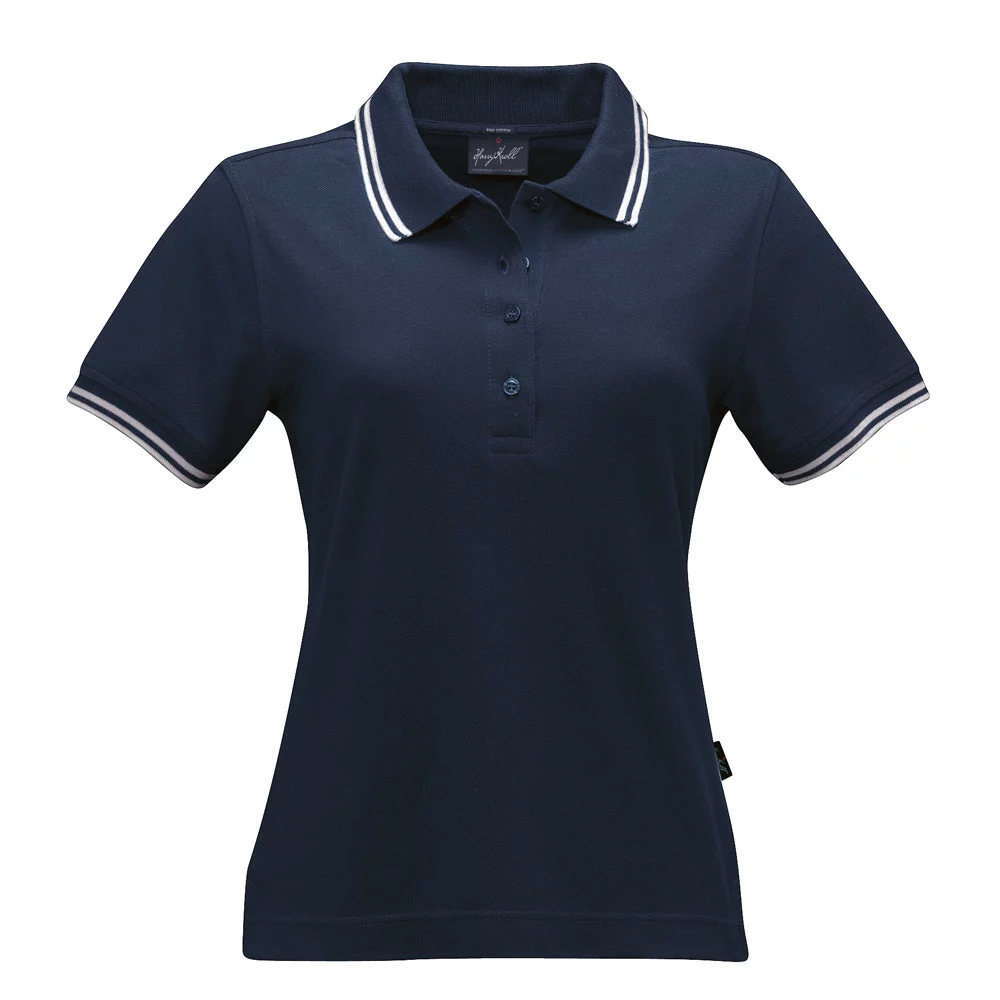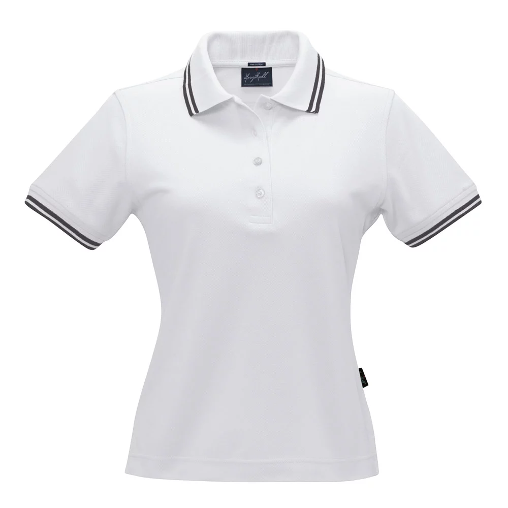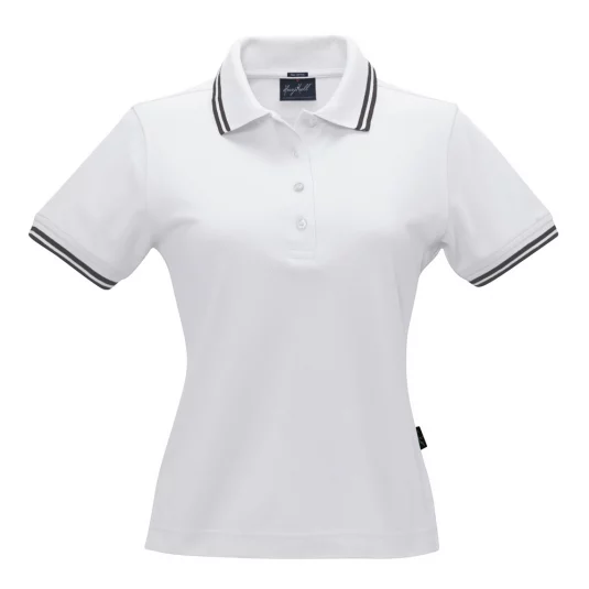 Women's polo shirt of fine mesh cotton piqué with narrow contrast stripes, body-skimming cut.