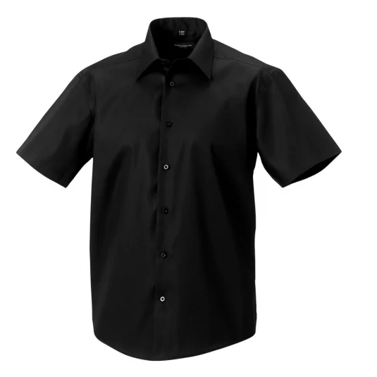 Russel body-skimming short-sleeved men's shirt of no-iron fabric, half spread collar stiffened with stays, rounded hem