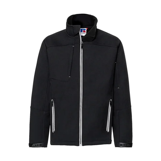 Bionic-Finish® Eco (3-layer softshell with hydrophobic membrane), fluorine and PFC free, wind and waterproof (5000 mm), breathable (5000 g/m² in 24h), stand-up collar, Hydroshell Air inserts in the underarm area, zipped chest, arm and side pockets, inner media mesh pocket, adjustable cuffs.