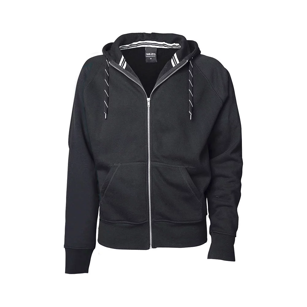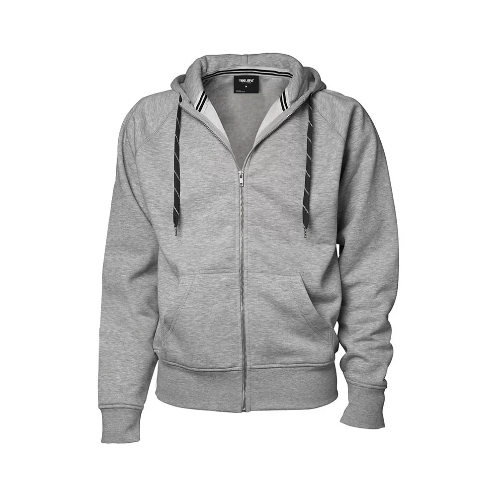 Trendy sweat jacket with hood, drawstring in contrasting color, patch pockets, elastic ribbing on sleeves and hem, full zipper in front, double stitching