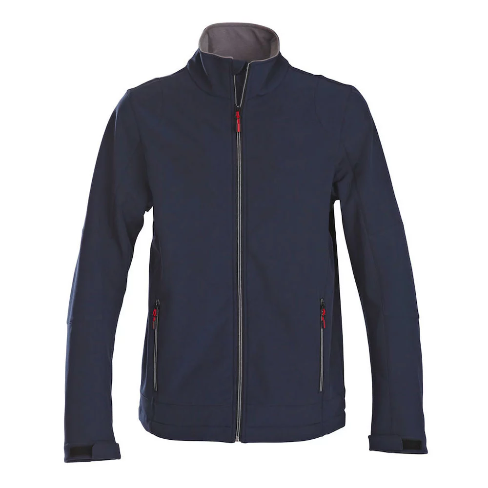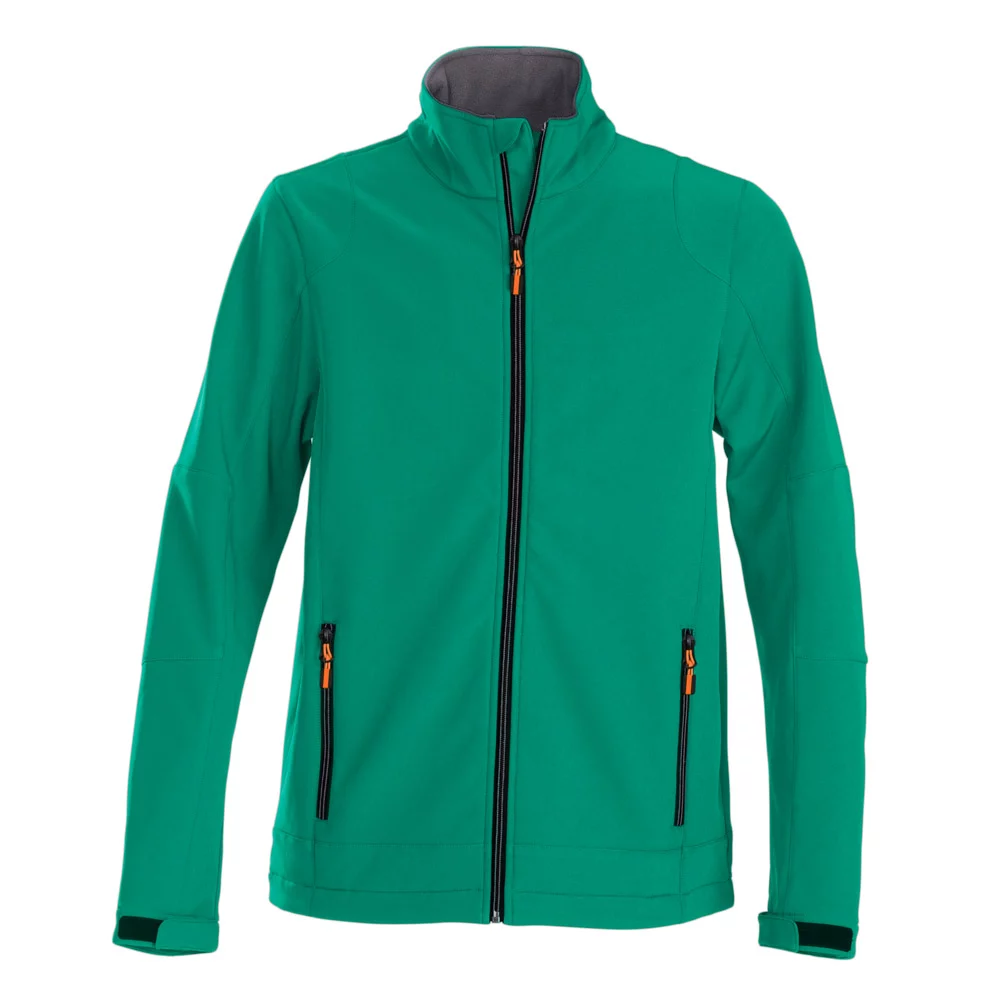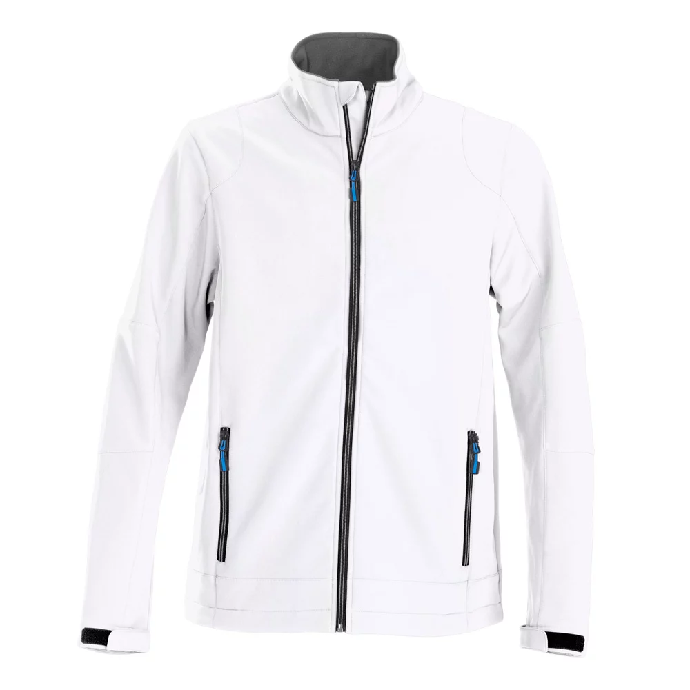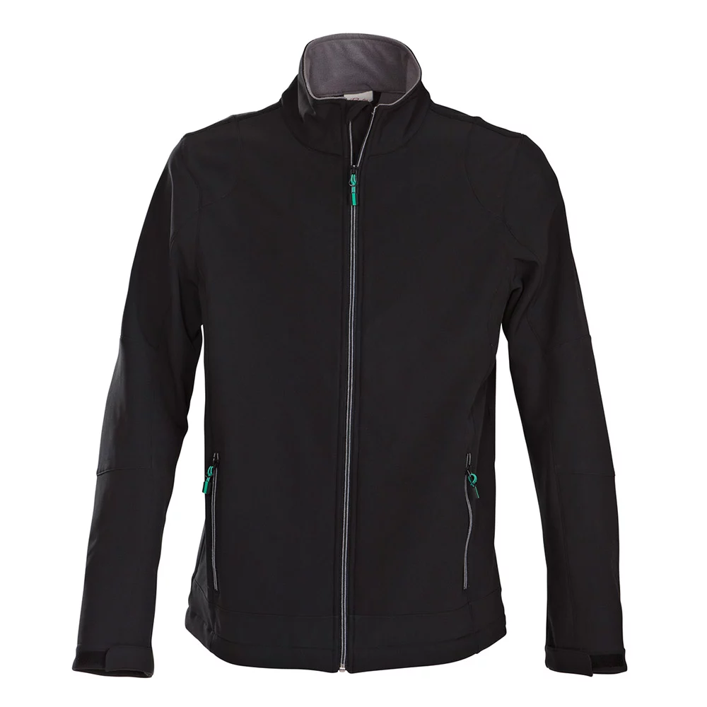 Softshell jacket with stretch fabric, two-color zippers in front and on the pockets, sleeves adjustable with Velcro and drawstring in band, the jacket can be matched to the company colors via various colored zippers