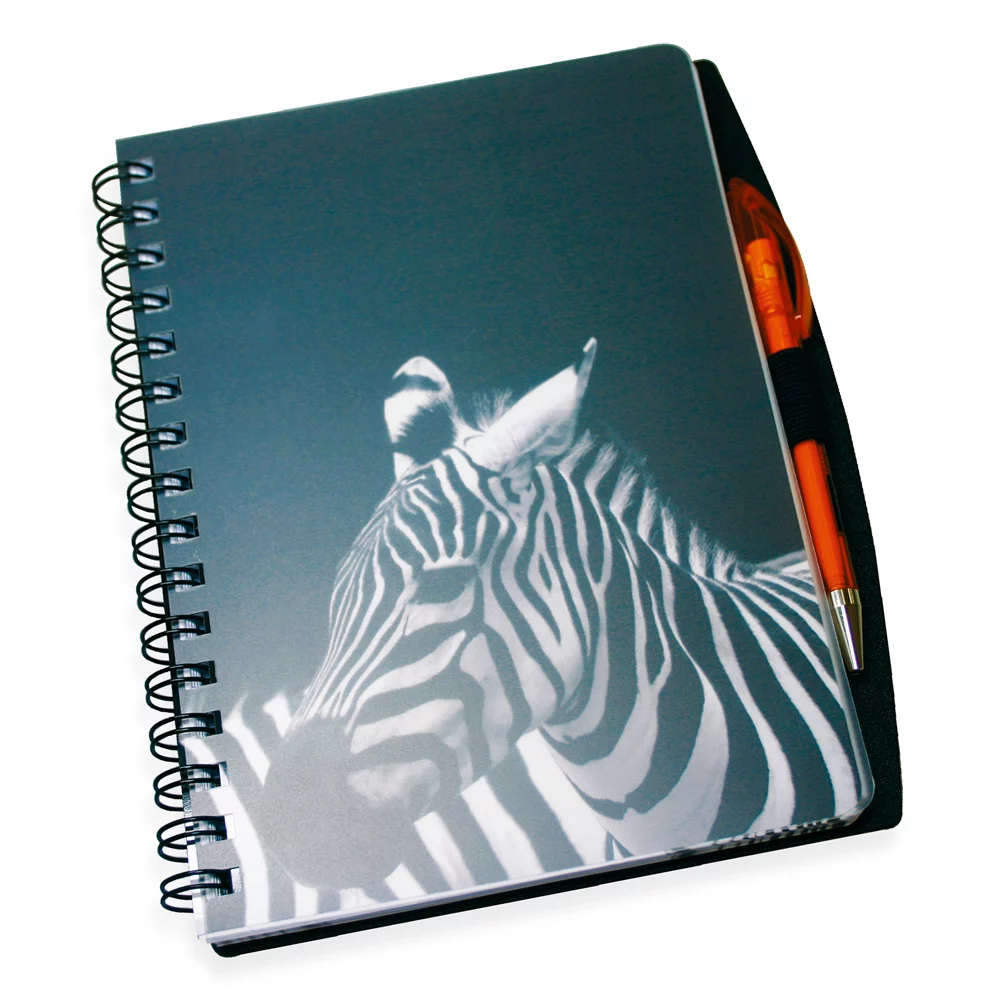Handy pad with plastic cover and Wiro binding, colorful printed front page in own design can be printed, contents 75 sheets paper, 80 g/m2, checked, on the side elastic loop for a pen, minimum order 100 pc
