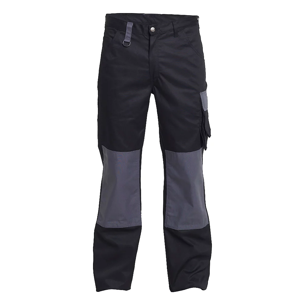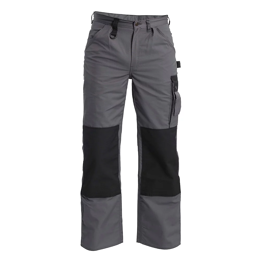 Working trousers with a modern cut, two side pockets, right with change pocket, two rear pockets, large thigh pocket with inverted pleat, as well as phone, pencil and tool pockets, tool loop, reinforced folding ruler pocket with elasticated pleat, knee reinforcement with Velcro fastening underneath, as well as place to put knee pads