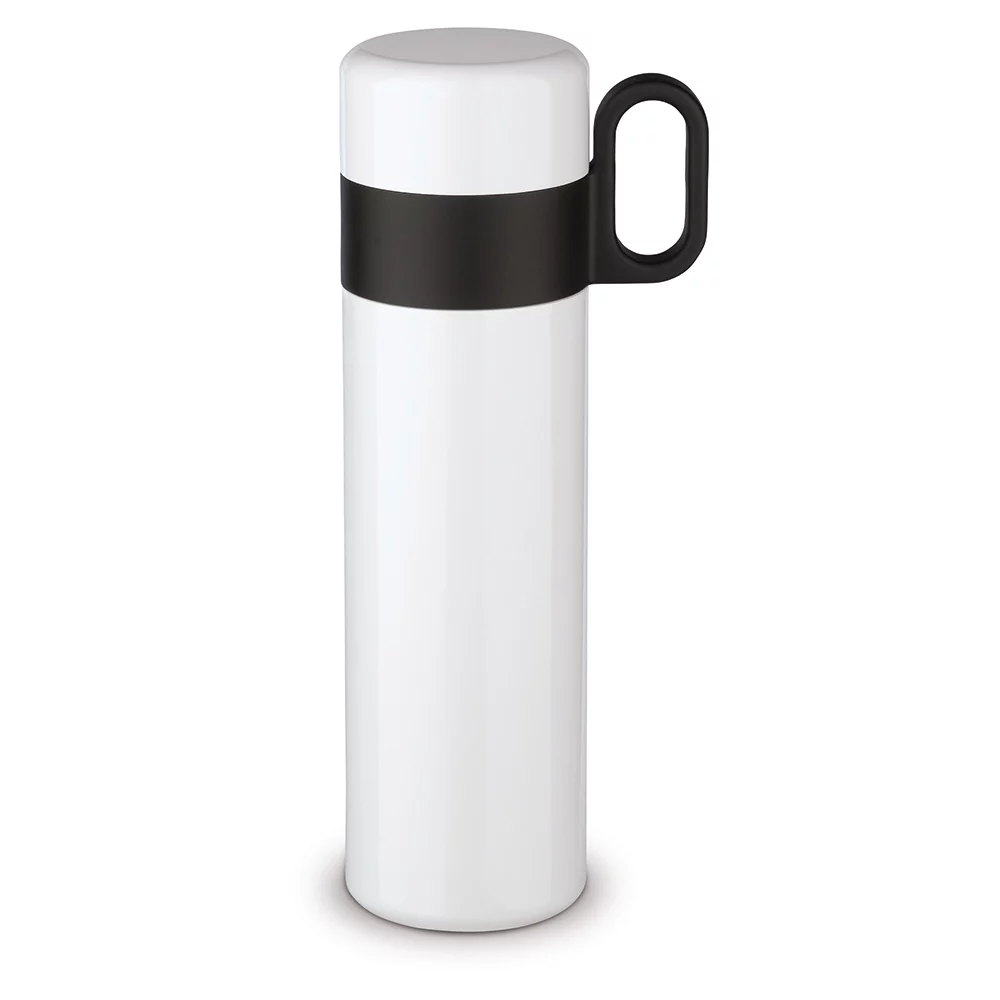 Bouteille isolante à double paroi avec gobelet servant aussi de bouchon, intérieur et extérieur en inox