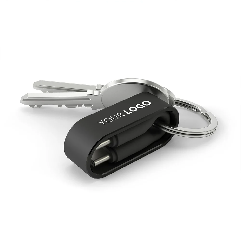 Câble de charge rapide compact USB-C vers USB-C en plastique et cuivre recyclé, avec vitesse de transfert de 480 Mbits/s, avec étui de protection pratique et porte-clés.