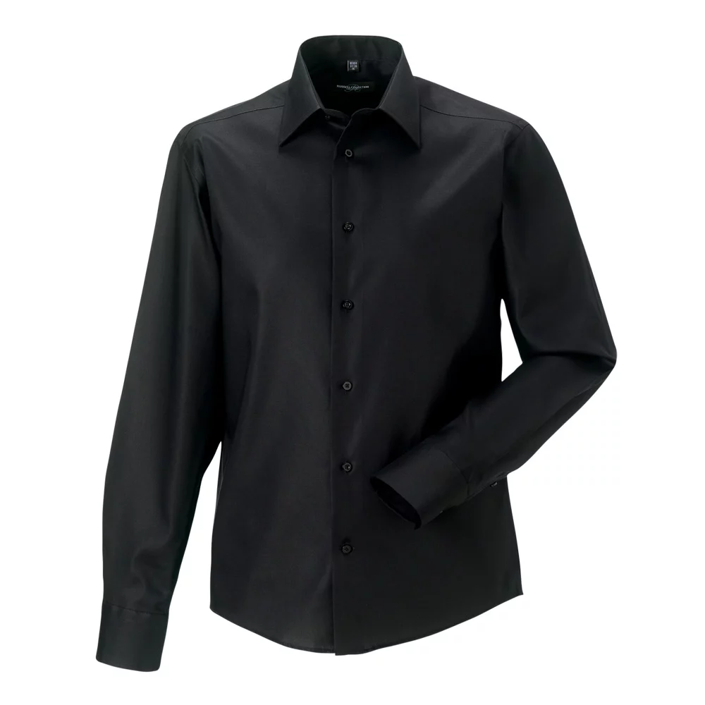 Chemise homme à manches longues, coupe serrée, textile non repassable, col renforcé à moitié relevé, ourlet arrondi