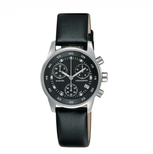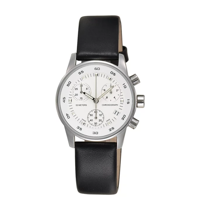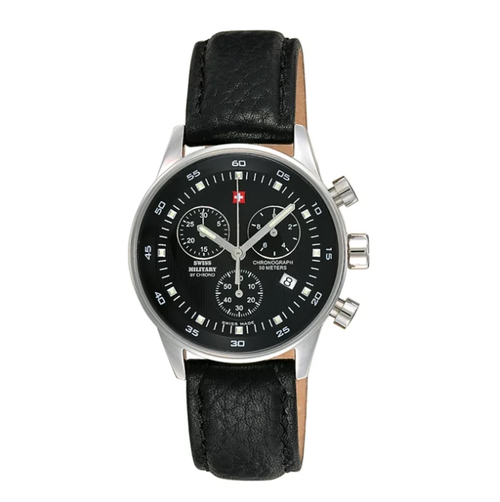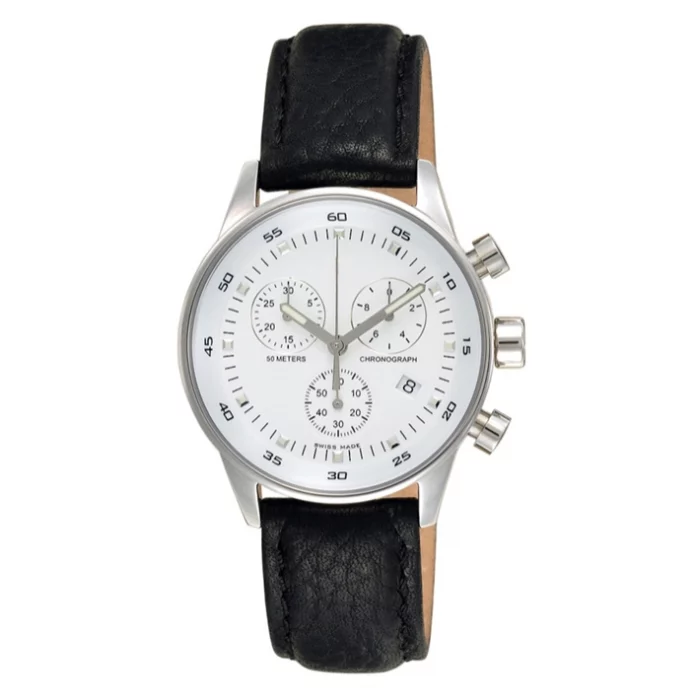 Swiss Made Chronographe Verre minéral Boîter acier Etanche jusqu'à 50 m Mouvement quartz Date Bracelet cuir Cadran noir Finitions spéciales telles que bracelet en acier ou cuir et boîte d'emballage de qualité suppérieur disponible sur demande en supplément de prix!
