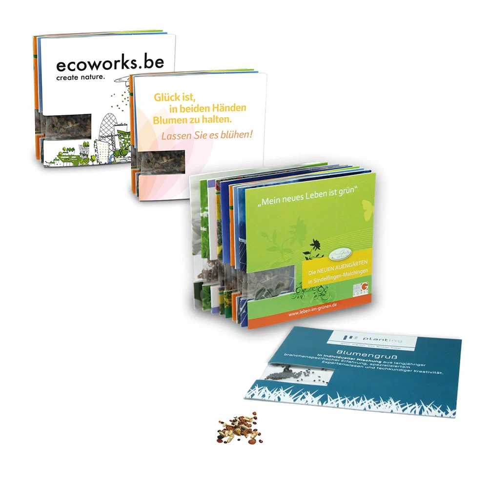 Support marketing attractif pour vos mailings ! 6 sortes de graines disponibles : tournesol, fleurs d'été, mélange d'herbes, paprika, basilic, herbe.