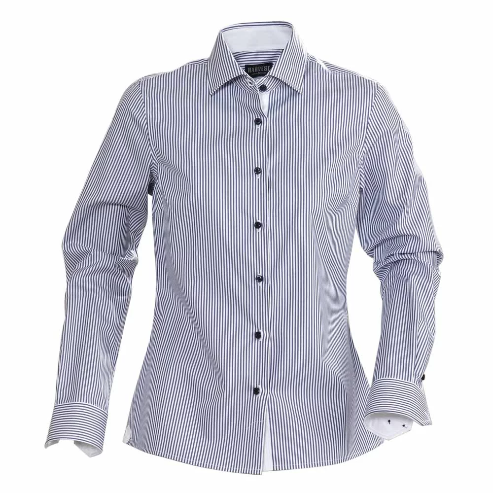 Chemisier classique en coton peigné avec traitement easy care. Coutures, col et manches renforcés. Motifs à rayures avec couleurs contrastées sous le col, sur la boutonnière et sur les manchettes. Coupe ajustée pour le modèle féminin.