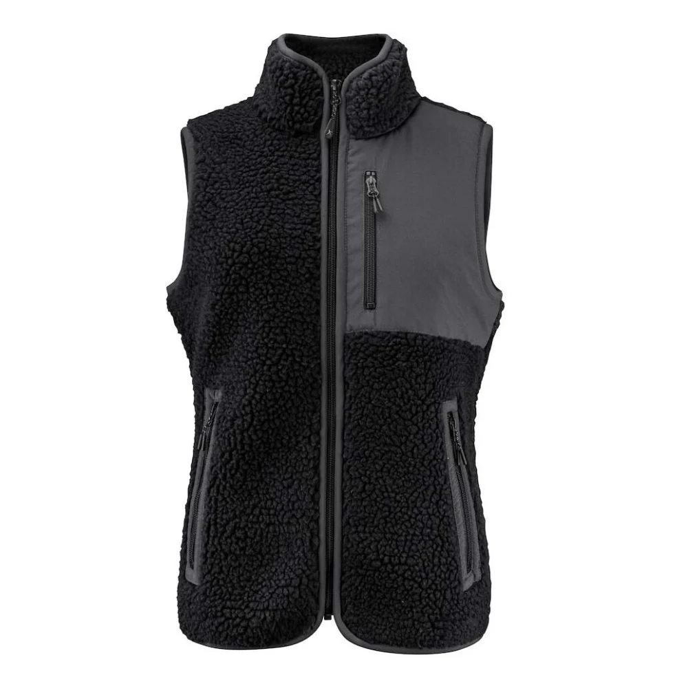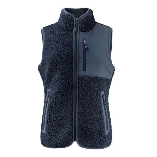 Gilet en polaire sherpa pour femmes, doux et chaud, comme élément du concept de superposition. Gilet bicolore en sherpa polaire pour femme. Matériau contrasté sur la poitrine et passepoil le long des bords des coutures. Poche de poitrine et poches latérales avec fermeture à glissière. Cet article est livré dans un polybag compostable.